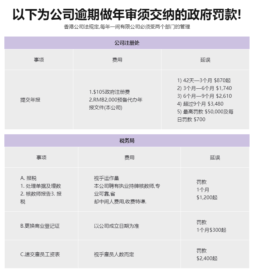香港公司年审时间:一年一审(成立日期前一个月办理)香港公司不年审会有什么后果1、账户冻结;银行将会冻结,无法收支款,无法取出越,甚至以后再也无法开户2、信用受损;可能会导致股东董事被记录不良信用,影响出入境和航班转机等3、政府罚款;政府罚款或起诉,还有法院下发传票,逾期最高HKD50000,每日罚款HKD700,